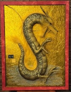 守護龍の郷の2階では、立体的に表現された黄金の龍アートが来訪者を迎えます。その迫力はまさに龍のエネルギーを感じさせます。
